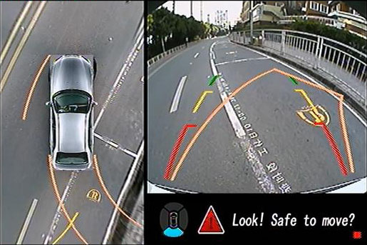 左右側(cè)倒車輔助線—通過切換不同視角,可以看到車前輪與障礙物之間的距離,為車主通過提供直接的提示。