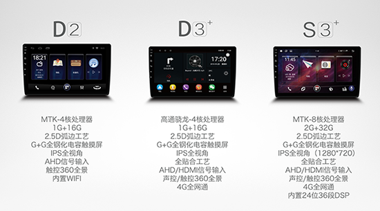 道可視4G車載影音導(dǎo)航系統(tǒng)D2、D3+、S3+的集體亮相也是一大亮點(diǎn),2.5D弧面屏、IPS全視角高清大屏、G+G觸摸屏的加入,擁有更清晰流暢的畫質(zhì)和更強(qiáng)的影像播放顯示,彰顯不凡氣質(zhì)。