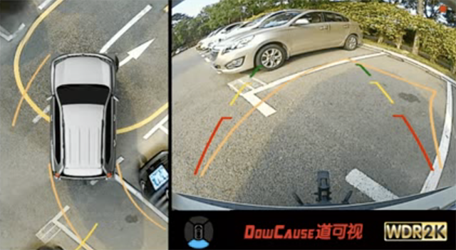 道可視360°全景通過(guò)“倒車(chē)入庫(kù)模式”,同時(shí)顯示倒車(chē)場(chǎng)景下的鳥(niǎo)瞰圖以及實(shí)時(shí)的后視影像,結(jié)合可跟隨方向盤(pán)方向而轉(zhuǎn)動(dòng)的精準(zhǔn)倒車(chē)軌跡線,精準(zhǔn)的計(jì)算出行車(chē)軌跡(誤差小于3CM),幫助駕駛員準(zhǔn)確、安全、平穩(wěn)的倒車(chē)入庫(kù)。